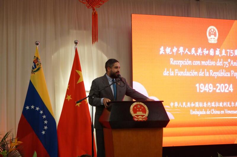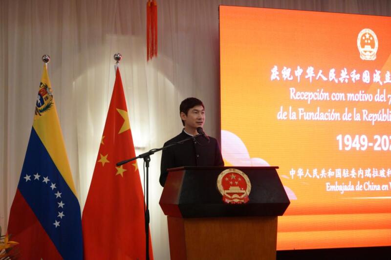 9月25日,驻委内瑞拉使馆隆重举办国庆75周年招待会。蓝虎大使和委执政党副主席、委中议会友好小组主席马杜罗·格拉致辞,部长理事会副主席兼电力部长马尔克斯、总检察长萨博、总监察长贝利萨、国防委员会秘书长奥尔内拉斯等党政军各方官员,学者、媒体、智库等社会各界友人,驻委使团代表与我馆主要外交官及中资机构、华侨华人和孔子学院师生代表400余人出席。